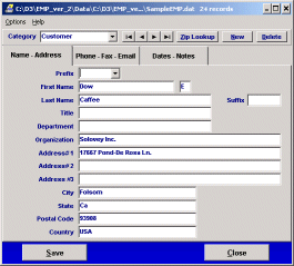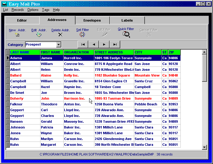 Advertising Director Number One Firm 1400 South One Street Somewhere, ST 99999 While Easy Mail Plus includes this method of handling addresses, it a;so features a comprehensive database format, ideal for managing larger lists. When using database, elements in the example above are entered into separate fields. That is, "Ms." is entered into the prefix field, "Mary" into the first name field, "L." into the initial field, and so forth. One way of looking at this difference, is that while entering a new address in database takes a bit more time, more data related to a name can be entered, and all of it can be used in a greater variety of ways. The following are available in Easy Mail Plus, in addition to the fast, easy envelope and label handling in Easy Mail. (Click here for a summary of Easy Mail features.)